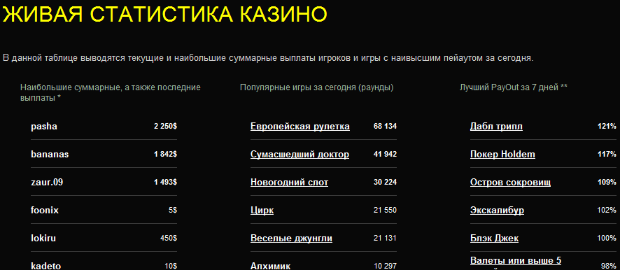 Изучая предоставленную информацию, ученые заметили следующие закономерности среди поведения игроков интернет казино. В обычный день шансы выиграть достаточно велики, пользователи выигрывают примерно 30% от своих ставок. Вы только что получили гигантский желаемый приз, поэтому возможность того, что вам повезет ровно также почти равна нулю. Только 11% пользователей выходят из игры, получив выигрыш. У многих остаётся не более 150$ долларов.