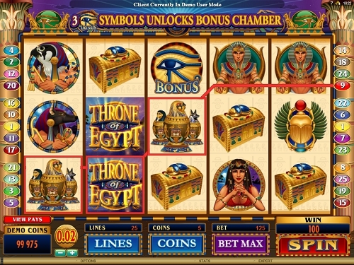 Без всяких сомнений Throne of Egypt это один из лучших слотов Microgaming. Благодаря четырём свои особенным функциям вы можете выиграть 500,000 кредитов. Этого вполне хватает для того, чтобы шикарно слетать в Египет и отлично провести там время, изучая оставшиеся с времен Древнего Египта реликвии.