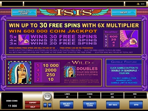 Isis это пяти барабанный не прогрессивный, игровой видеослот от компании Microgaming. У слота 25 линий выплат, также у него имеется дикий символ, рассыпной символ, множитель, бесплатные вращения, а максимальный джек-пот составляет $37,500.