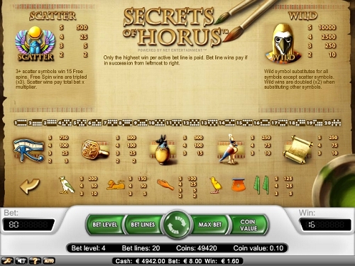 У слота Secret of Horus пять барабанов и 20 линий выплат, игра была сделана на древнеегипетскую тему, а главным персонажем данной игры является, древне египетское божество Хор, сын Осириса. У данной игры есть все прелести современных слотов, от дикого символа до множителя, но, к сожалению, отсутствует бонусная игра. Панель управления слота такая же, как и у остальных слотов NetEnt. Кроме того, присутствует кнопка остановки барабанов. Барабаны выглядят, как пять папирусов перед двумя колоннами, а над ними висит каменная пластина с древнеегипетскими иероглифами. Под барабанами находится большой священный скарабей.