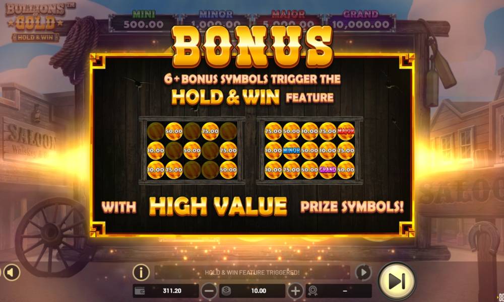 Общие игровые правила в Bullions of Gold довольно стандартные и их изучение не вызовет затруднений даже у начинающих гемблеров. Пять барабанов высотой в 3 ячейки разыгрывают комбинации по 25 фиксированным линиям. Учет знаков идет от левого края игрового поля к правому, а для получения выигрыша требуется три одинаковых символа подряд. Ставку назначает сам игрок, выбирая среди готовых значений от 0.25 до 187.5 евро. Остается загадкой, почему провайдер выбрал именно такой диапазон. Максимальный выигрыш может достичь х5000 от ставки. Вместо фриспинов в слоте действуют респины системы Hold&Win с джекпотами. Любые другие бонусы отсутствуют.