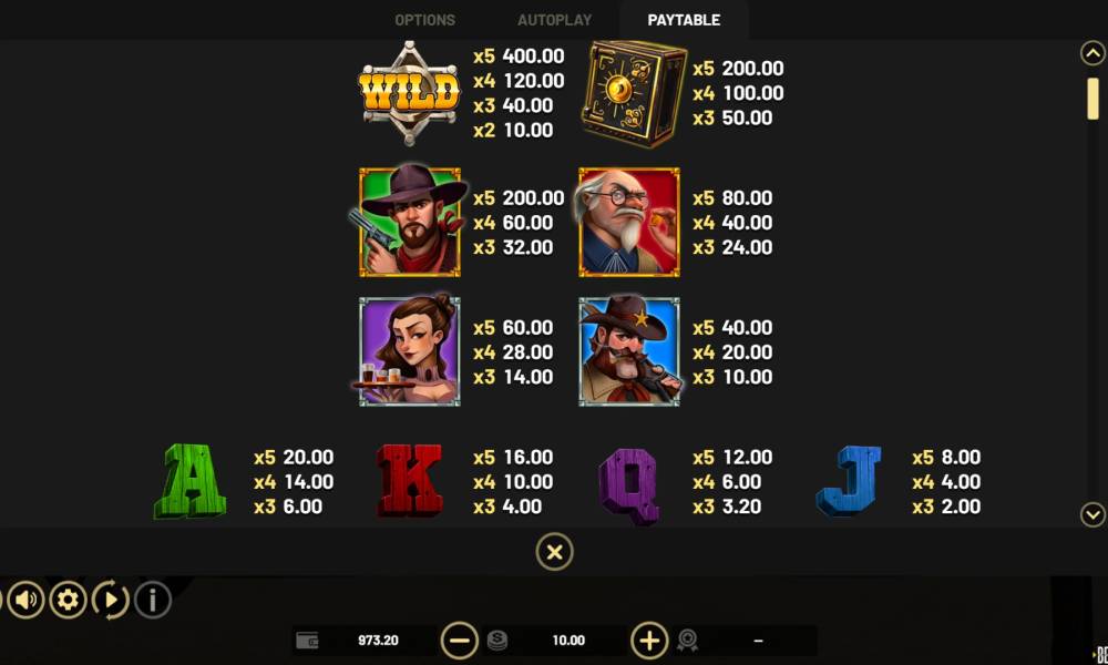 Интерфейс слота выполнен в стиле Дикого Запада, отлично передавая атмосферу игры. Освоиться в управлении довольно просто. Центральную часть экрана занимает игровое поле с размещенной над ним таблицей джекпотов. Чуть ниже расположена панель с основными кнопками: справка (i), настройка ставки с помощью «+» и «–», а также запуск вращений (Spin или Auto). Начать играть — проще простого: