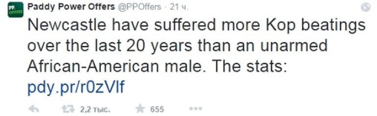 Перед футбольным матчем между клубами Ливерпуля и Ньюкасла от имени официальной странички Paddy Power Offers в сети Twitter было опубликовано сообщение, гласившее: «Ньюкасл за последние двадцать лет больше страдает от избиений полиции, чем невооружённые афро-американцы». Также сообщение было дополнено портретом улыбающегося руководителя ФК Ливерпуль, Брендана Роджерса, и привело в бешенство пользователей социальных сетей, выступивших с резкой критикой неуместного, по их мнению, сравнения.
